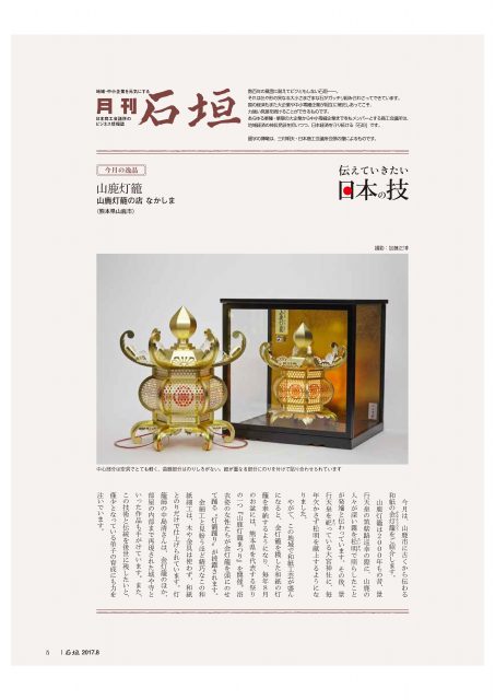 日本商工会議所発行の月刊誌『石垣』8月号におきまして山鹿灯籠が表紙を飾り、記事にもしていただきました。